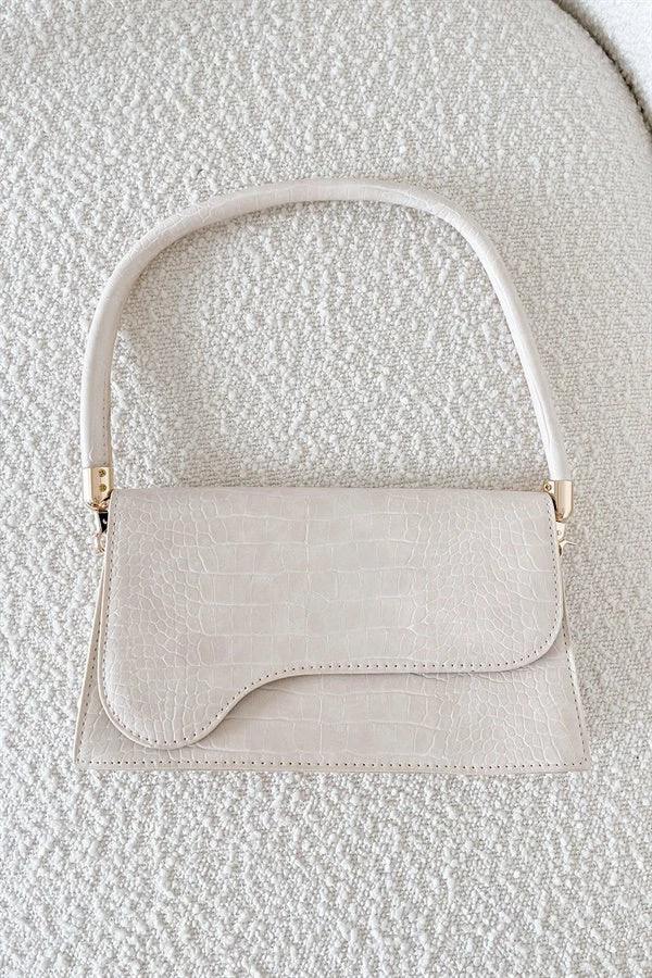 A super cute go-to neutral style, the Tatti Bag is made from a white wash nude vegan croc and features an asymmetric flap closure and includes an arm strap and crossbody strap to suit your style!