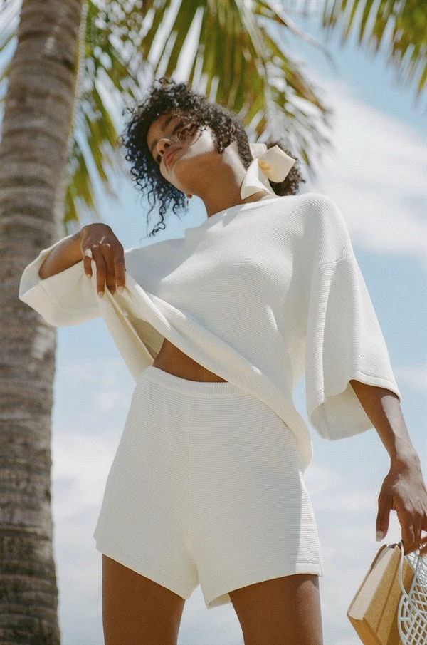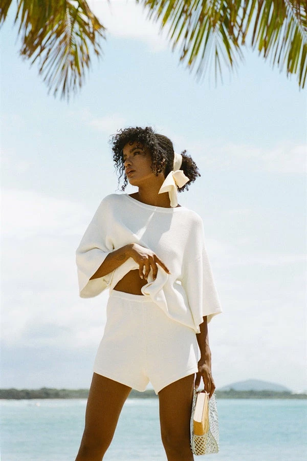 *THIS IS A FINAL SALE ITEM* Wear them as a set or style them your way! The Telisa Shorts are made from a natural cotton knit in a cream hue. They are a high waisted style featuring an elasticated waist, contrast ribbed trims and high-low hems. Pair with the Telisa Top and Golden Lattice Earrings! Exclusively designed by Sabo.