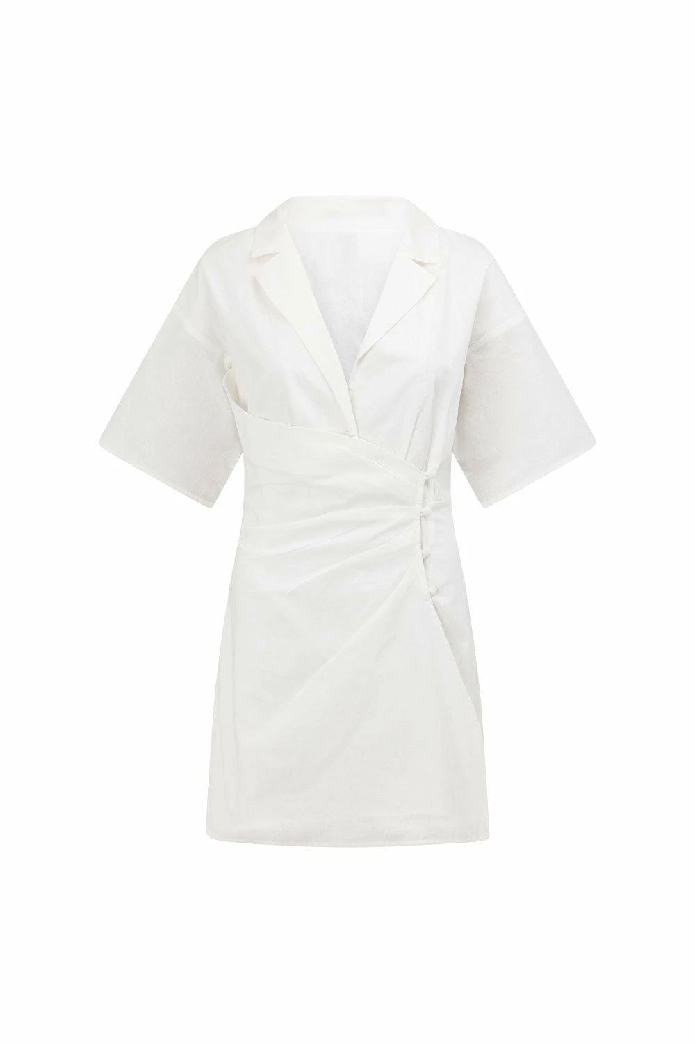 Dress it up with heels or keep it casual with slides! The Teodora Wrap Dress is made from a structured natural cotton linen blend fabric in white. It features a collar and low lapel and wrap front skirt with covered button closure details. Designed exclusively by Sabo.