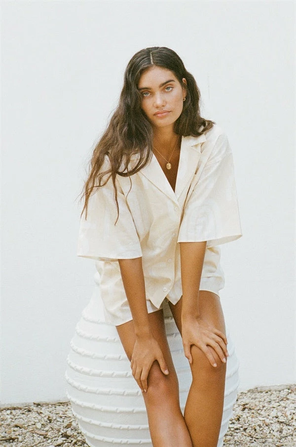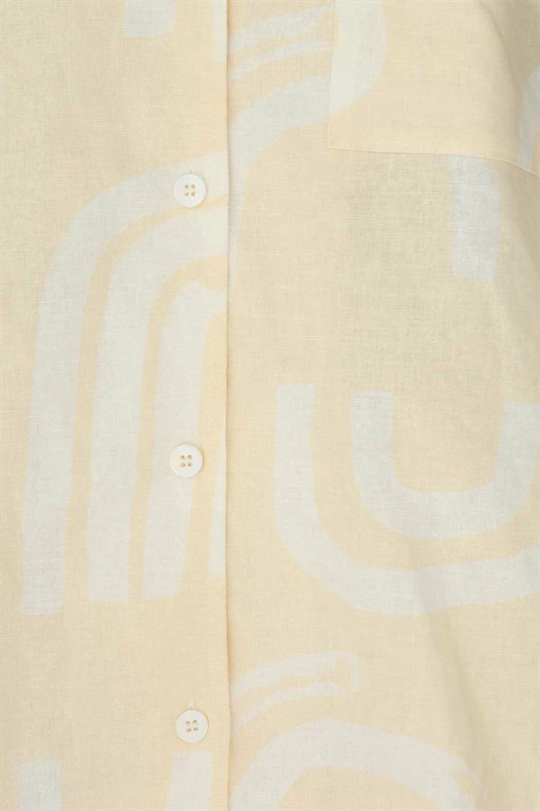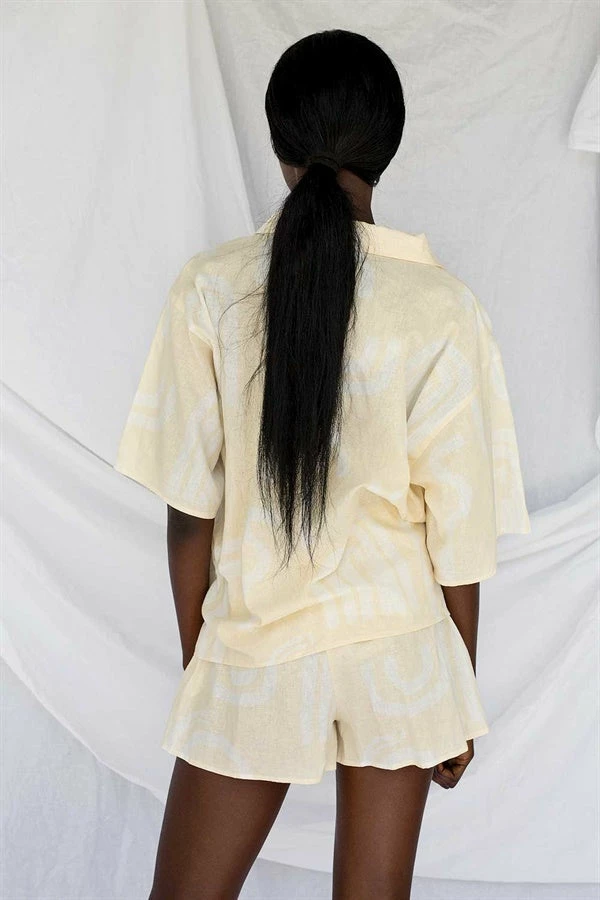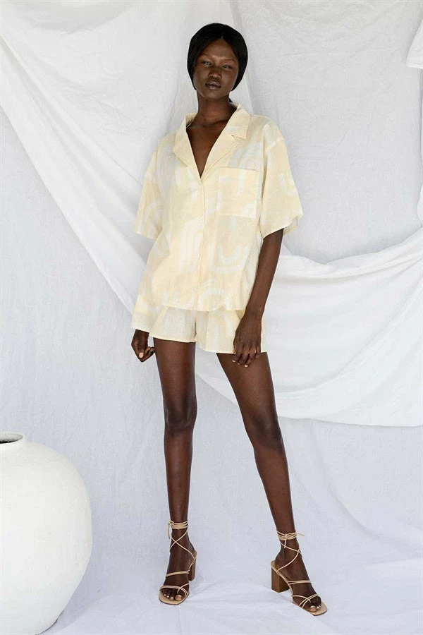 *THIS IS A FINAL SALE ITEM* The perfect vacay outfit has arrived! The Thessy Top is made from a structured linen cotton blend cream fabric with our exclusive line print throughout. It is a relaxed style featuring 1/2 length sleeves, single breast pocket, buttons down centre front and a lapel collar. Get the look with the Thessy Shorts and white sandals! Exclusively designed by Sabo.