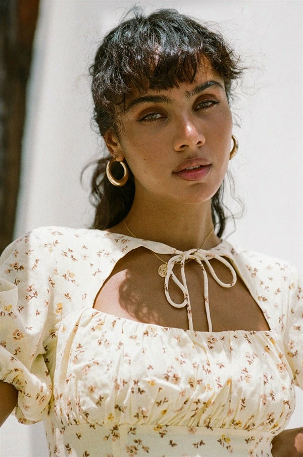*THIS IS A FINAL SALE ITEM* Inspired by Tuscan summers, the Tialeigh Dress is made from a natural cotton blend fabric in a yellow hue. It features a floral print throughout, short puff sleeves, rouching across bust and a cutout neck tie. Pair with the Strappy Lotus Heels for your next event! Exclusively designed by Sabo.