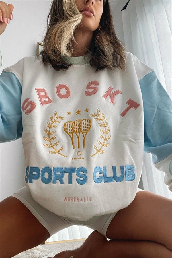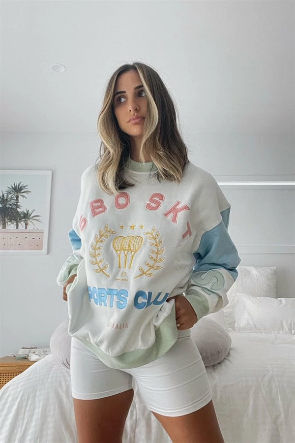 The ‘it’ sweater has landed! The Tien Sweater is made from a soft cotton blend fleecy back fabric in blue, white and green hues. It is a relaxed style featuring a crew neckline, full length sleeves and embroidered detailing at front and sleeves. Pair with the Taffy Bike Shorts and sneakers! Designed exclusively by Sabo.