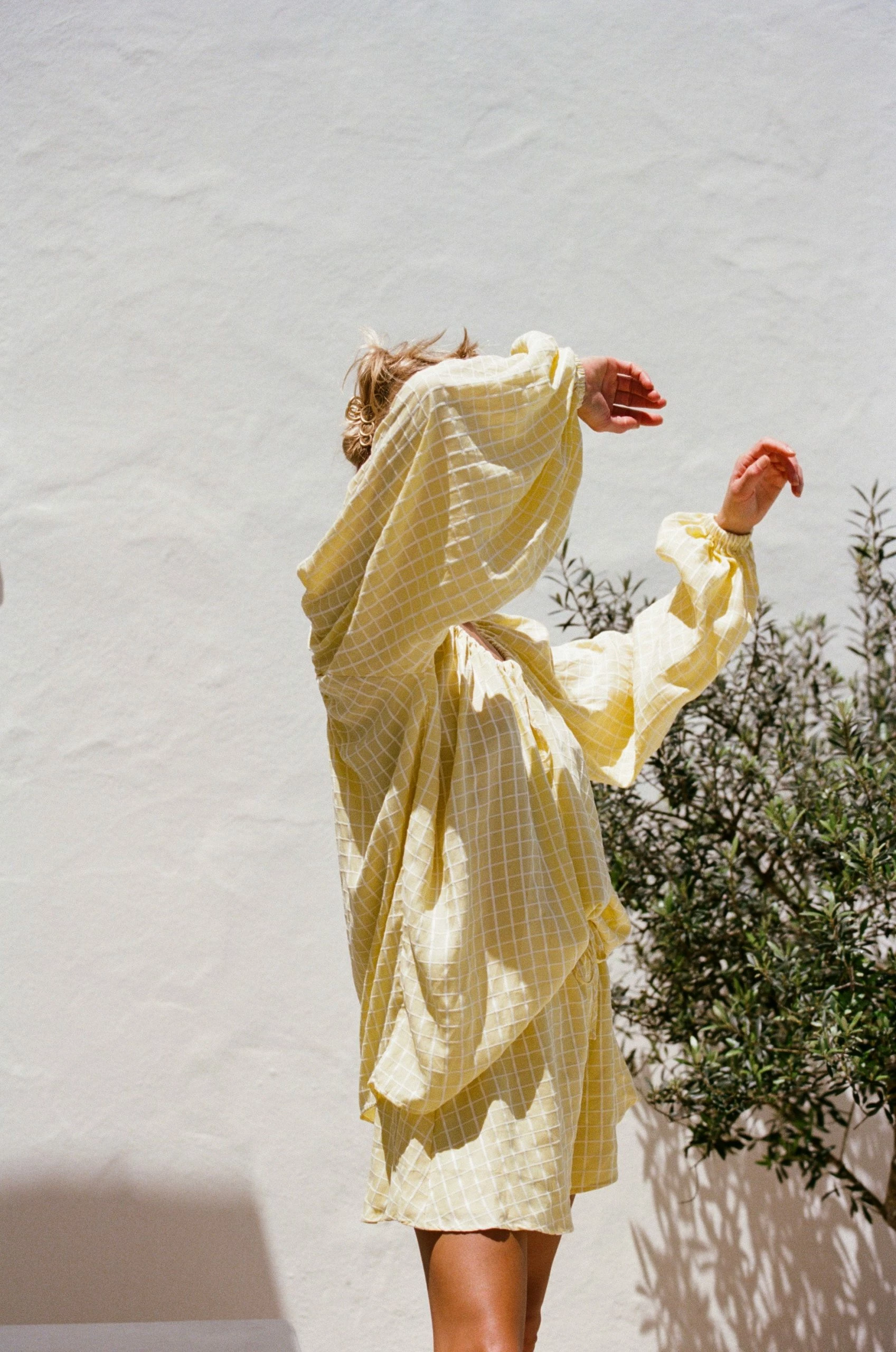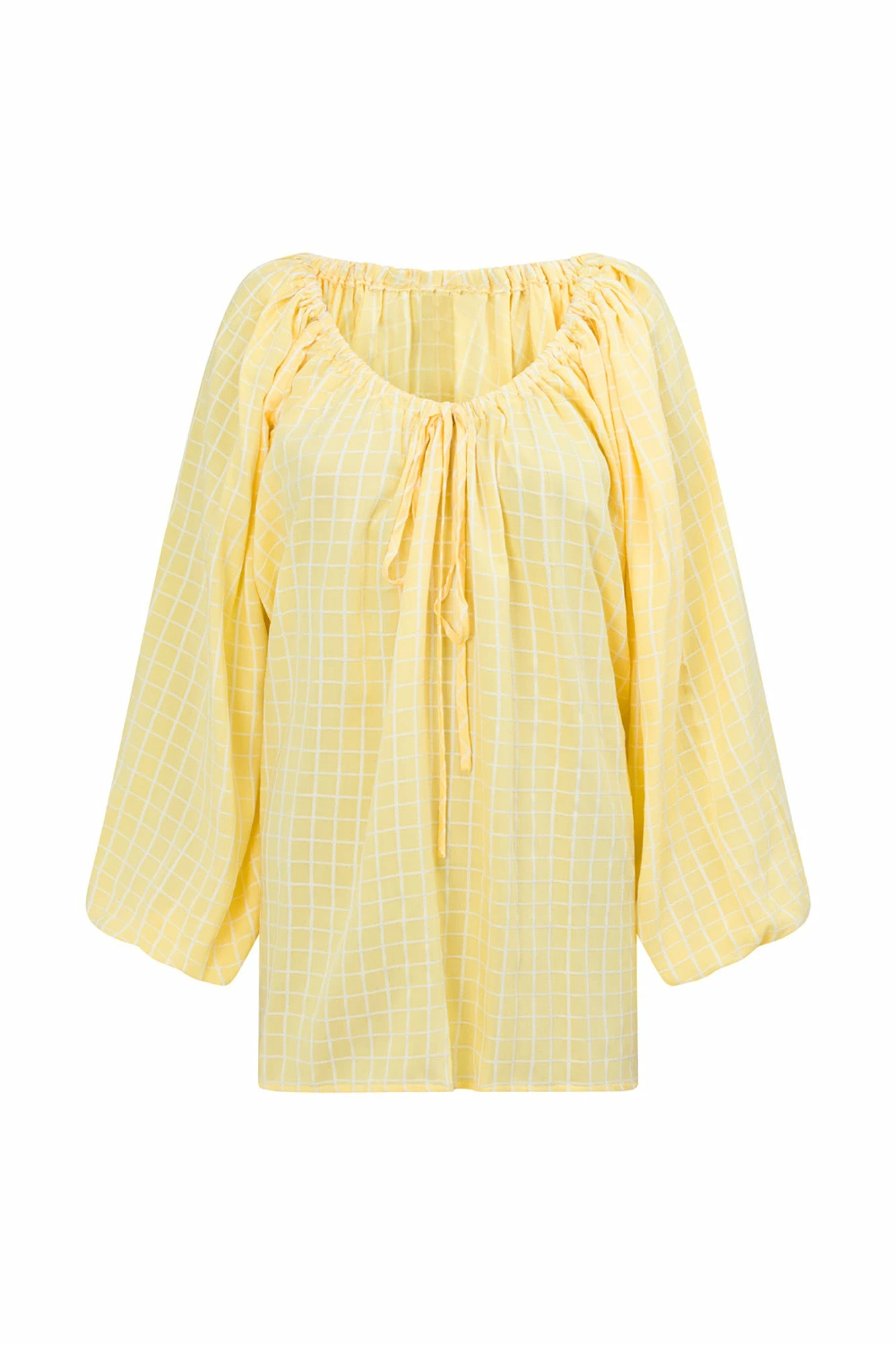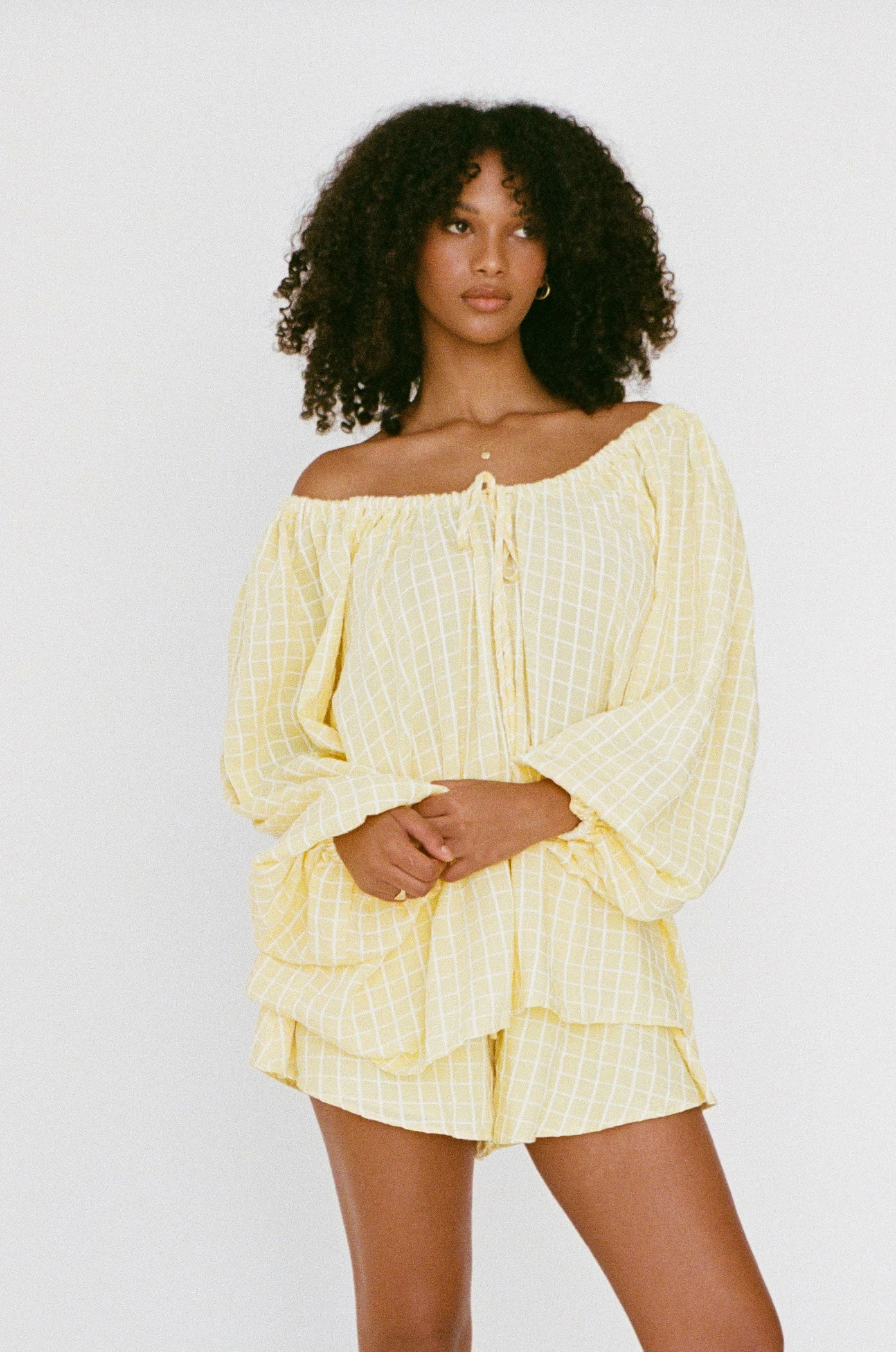 Wear it as a set or pair it with denim shorts, the Tilli Top is made from a soft lightweight yellow fabric with a textured check throughout. It is a relaxed style featuring full length billowing puff sleeves and a wide rounded neckline with draw tie detail. Get the look with the Tilli Shorts! Designed exclusively by Sabo.