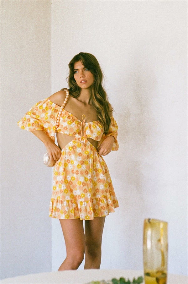 The French inspired Toria Off Shoulder Dress is made from a high quality natural cotton fabric with our floral impala print. It features boxy 1/2 length sleeves, elastic neckline with draw tie, cutouts at centre bust and waist, a flouncy skirt and frill detailed hems. Style with the Transparent Mules and Lima Saddle Bag! Designed exclusively by Sabo.