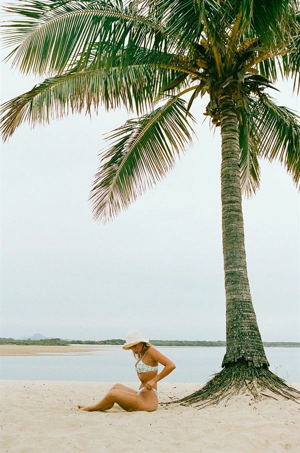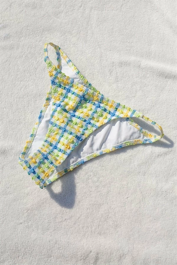 The Torquay Brazilian Bottom is made from a textured seersucker fabric in a blue, green and yellow gingham. They are a mid-high waisted style featuring string sides. Pair with your favourite style top! Designed exclusively by Sabo.