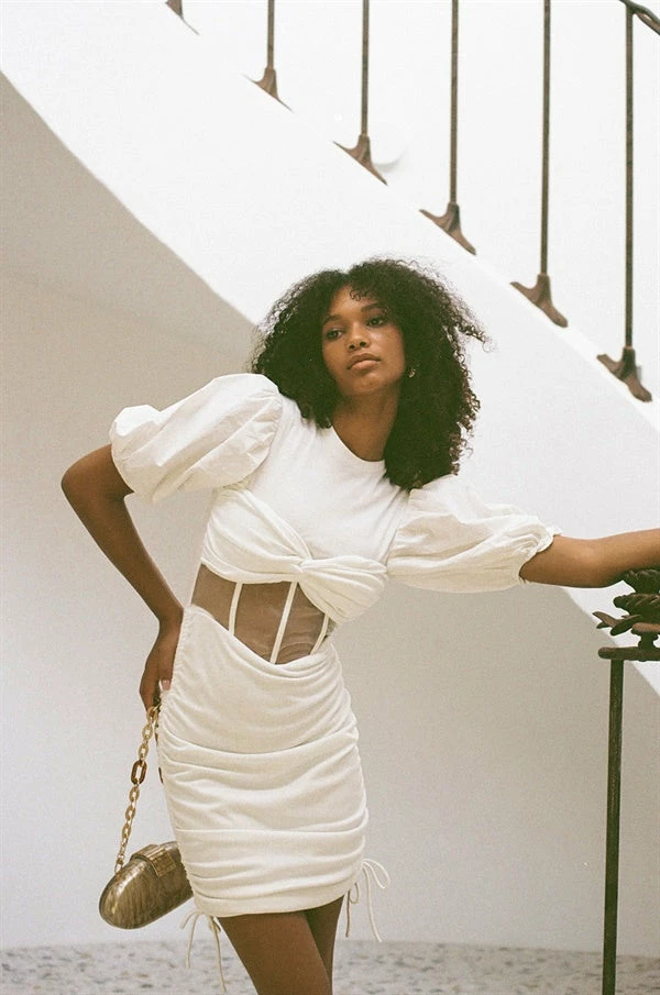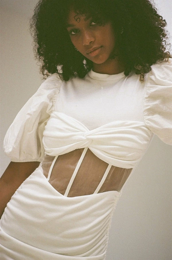 Let us do the layering! The Venezia Corset Dress is made from an off white jersey fabric. It features short puff sleeves, high rounded neckline, overlay bust detail, sheer boned corset and fitted gathered skirt with adjustable drawstrings at sides. Pair with the Transparent Mules for your next night out! Designed exclusively by Sabo.