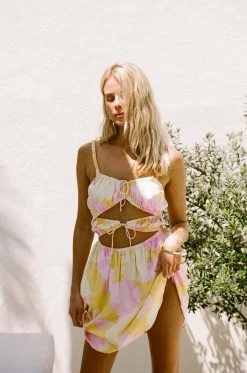 Introducing our new and exclusive flutter print! The Venus Cutout Dress is made from a high quality natural linen cotton blend fabric. It features thin elastic straps, ties at bust and waist, cutouts at waist and a flouncy skirt. Dress it up with the Strappy Leila Heels! Designed exclusively by Sabo.