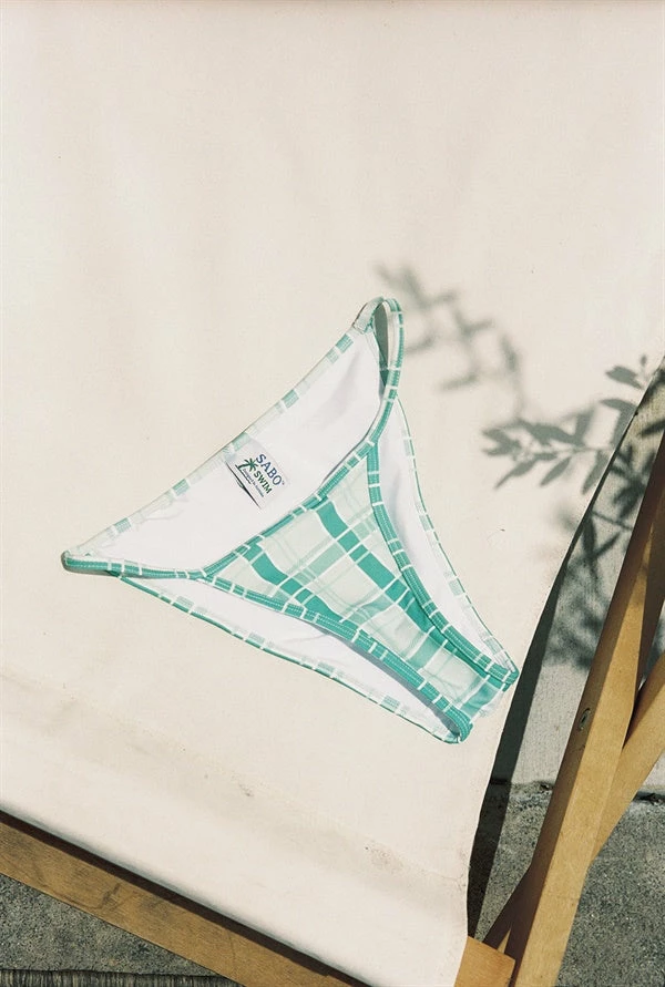 *THIS IS A FINAL SALE ITEM* The ideal summer uniform! The Verde Brazilian Bottom features our exclusive check print in green hues. They are a mid-high waisted style featuring string sides and a cheeky cut. Pair with the Verde Tie Top and Verde Scrunchie! Exclusively designed by Sabo.