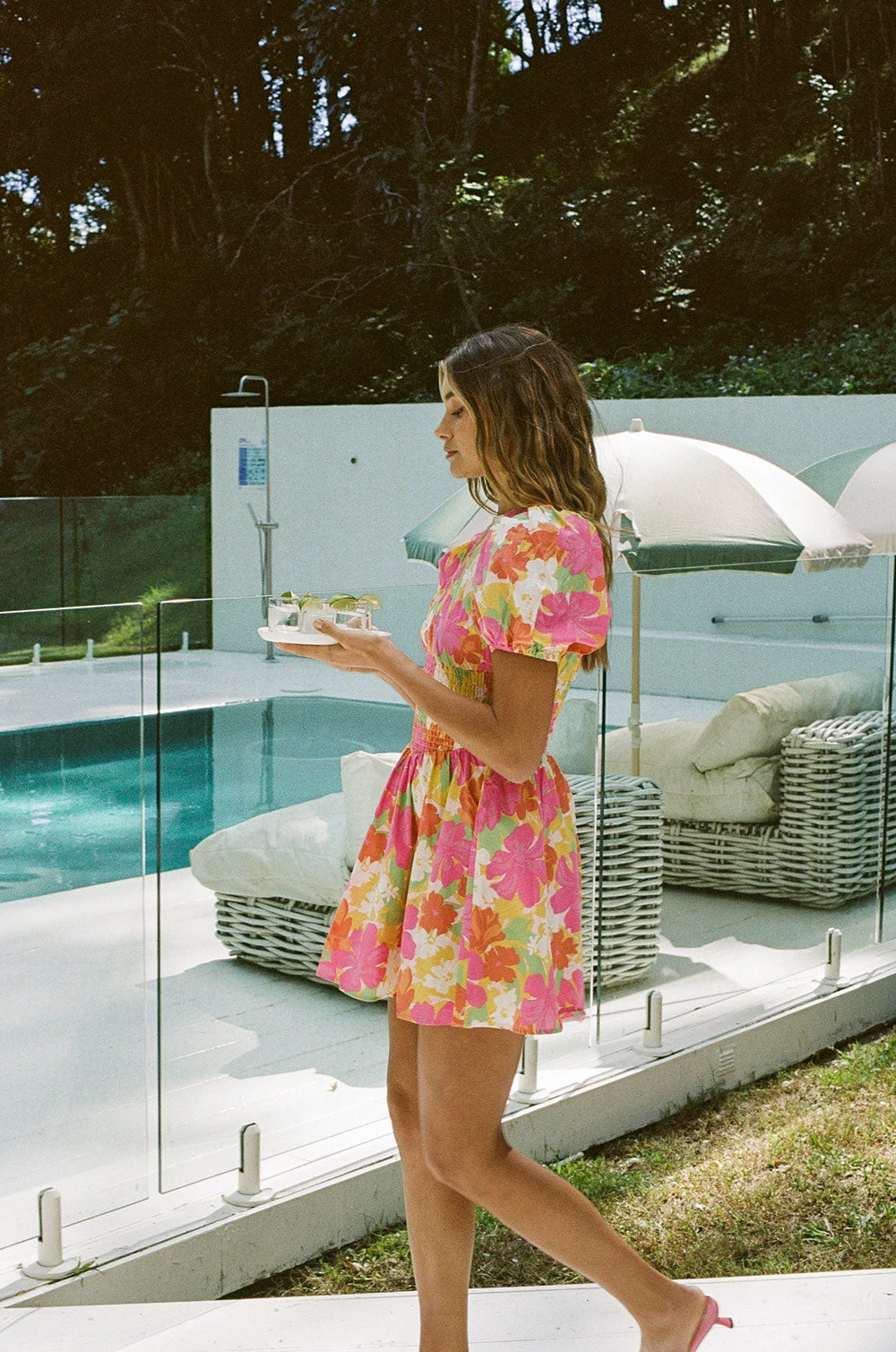 Make a statement and step out in our brand new pink pacific floral print! The Veronika Shirred Dress is made from a high quality natural cotton fabric and features a high rounded neck with shirring across neckline and waist, short puff sleeves and a flouncy skirt. Complete the look with the Strappy Asteria Heels and gold accessories! Designed exclusively by Sabo.