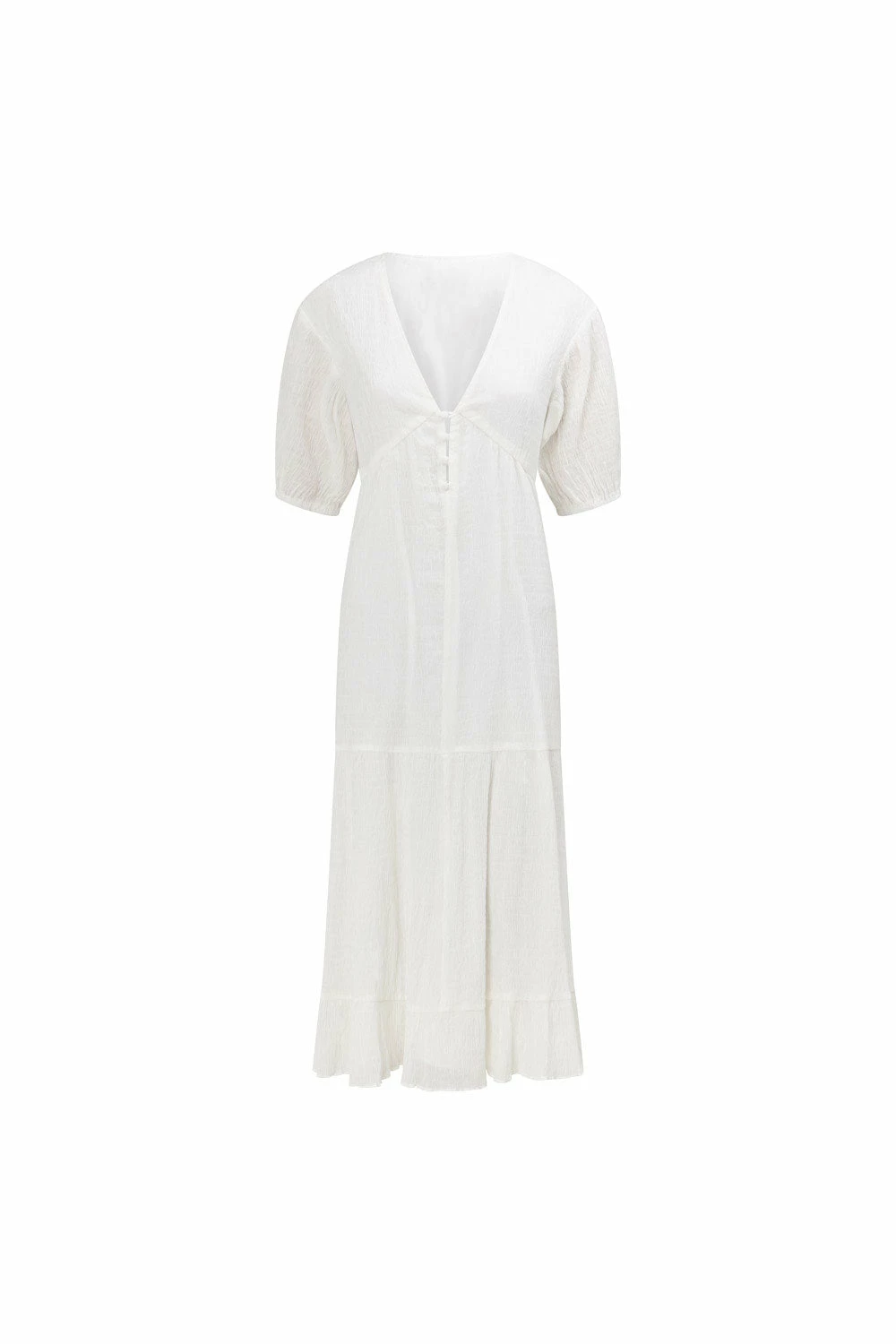 One of our customer favourite shapes now in a whimsical midi length! The Vittoria Midi Dress is made from a lightweight textured fabric in white. It is a relaxed style featuring short puff sleeves, V neckline with covered button details and flouncy triple tiered skirt. Style with slides and sunnies for a cute weekend look! Designed exclusively by Sabo.