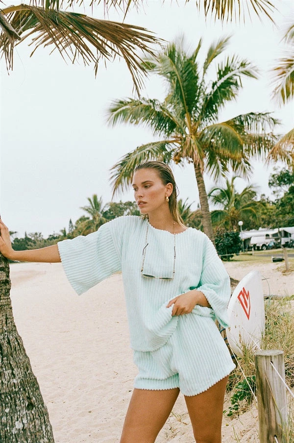 Our fresh take on the cult favourite Wanderer Shorts is a must! Made from a fluffy minky stripe fabric in baby blue hue, They are a high waisted style featuring an elasticated waist and high-low hems. Get the look with the Wanderer Tee and pair with sandals! Designed exclusively by Sabo.