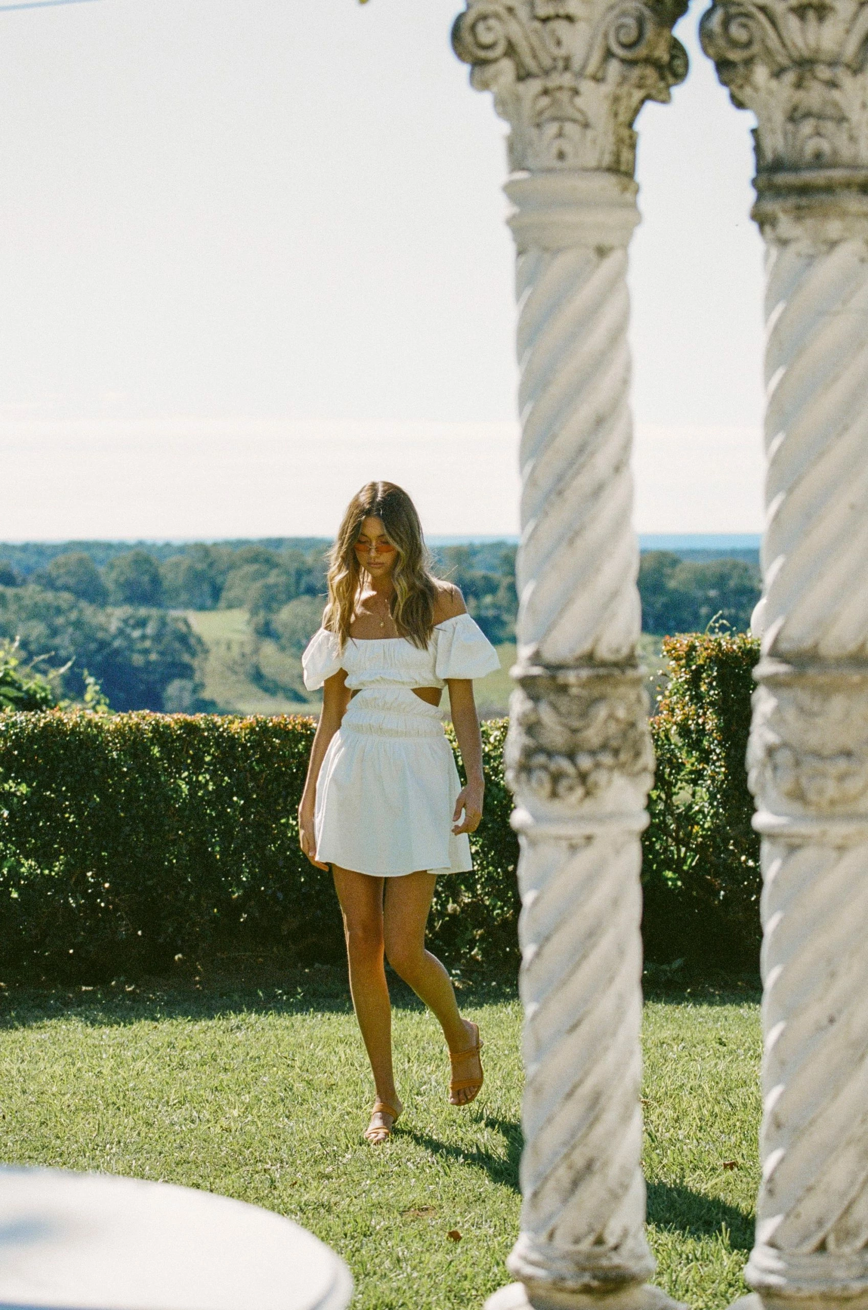 Keep it casual with sandals or dress it up with heels! The Wolfie Dress is made from a structured cotton fabric in white. It features short puff sleeves, scoop neckline, cutout at waist and elastic detailing across waist. Designed exclusively by Sabo.