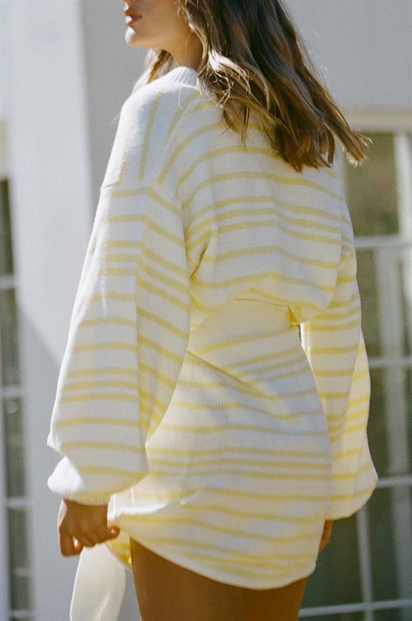 *THIS IS A FINAL SALE ITEM* The cosy and trans seasonal Zamana Knit Dress is made from a soft knitted fabric with yellow and off-white stripes throughout. It is a relaxed style featuring full length puff sleeves and V neckline. Use the waist tie to cinch in at waist and pull fabric over to achieve the look! Designed exclusively by Sabo.