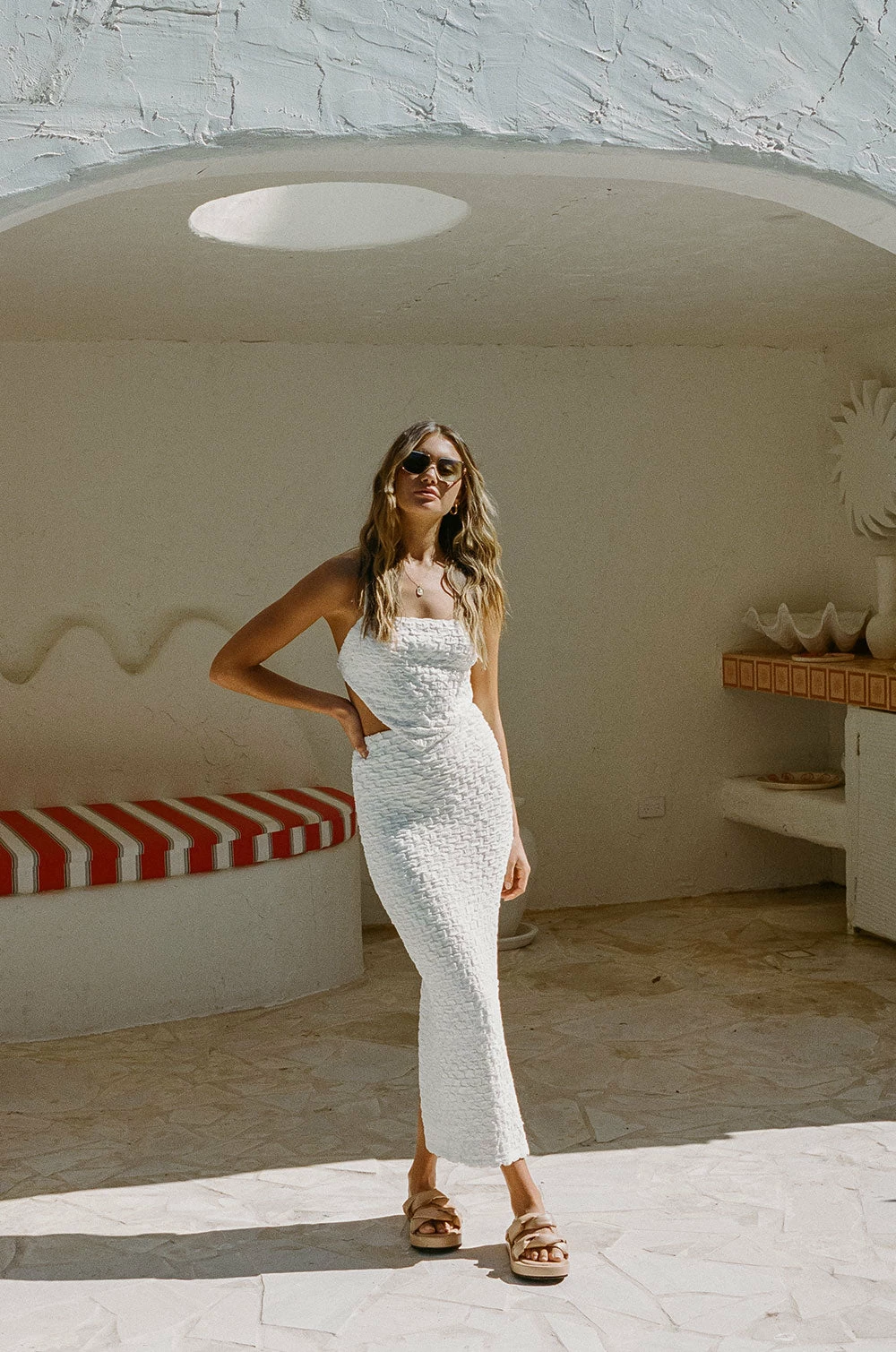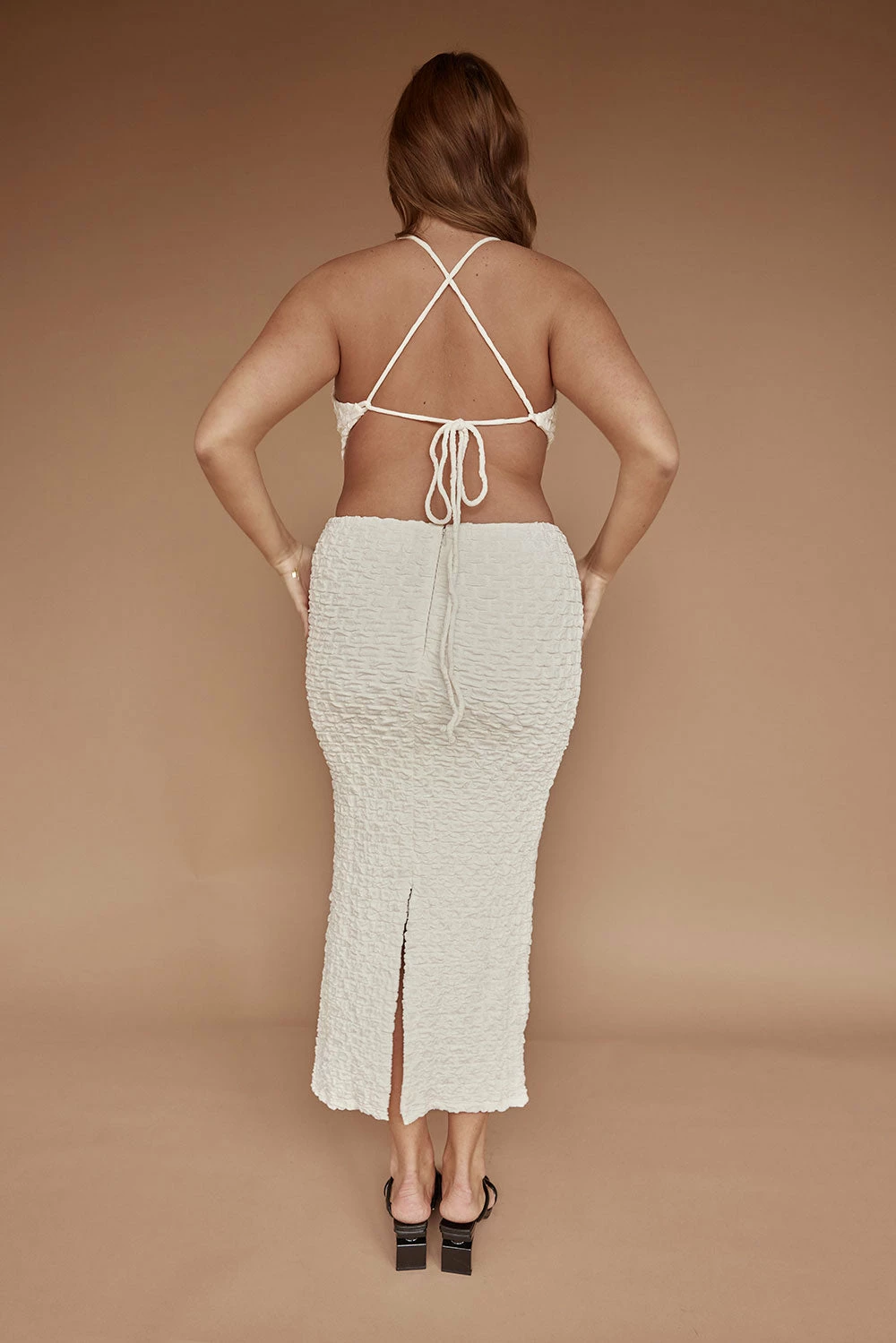 Obsessed with this fabric! The Zantina Maxi Skirt is made from a textured bubble cotton blend fabric in an off white hue. It is a high waisted fitted style with a centre back split. Get the set and pair with the Backless Wren Top! Designed exclusively by Sabo.