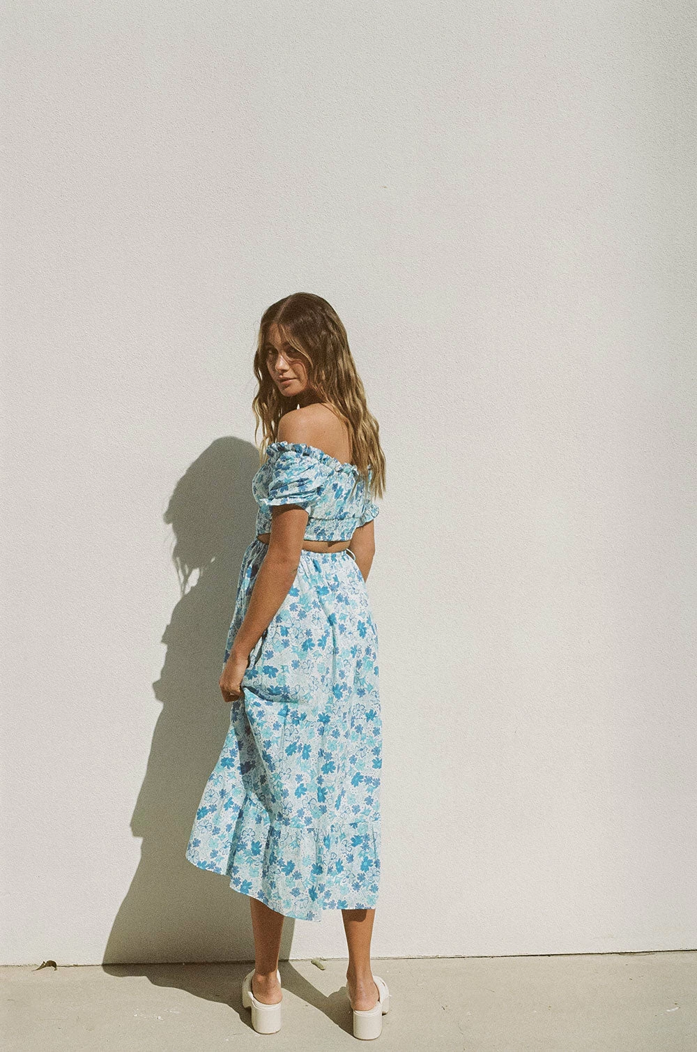 Perfect for an event or a girls lunch! The Zara Midi Dress is made from a high quality natural cotton voile fabric with our exclusive blue dusk floral print. It is a midi off shoulder style featuring short puff sleeves, covered button details at centre front, shirred bodice, cutouts at waist with ties at sides of skirt and a flowy tiered skirt. Accessories with the Amal Pearl Hoops and Inka Pearl Bracelet! Designed exclusively by Sabo.