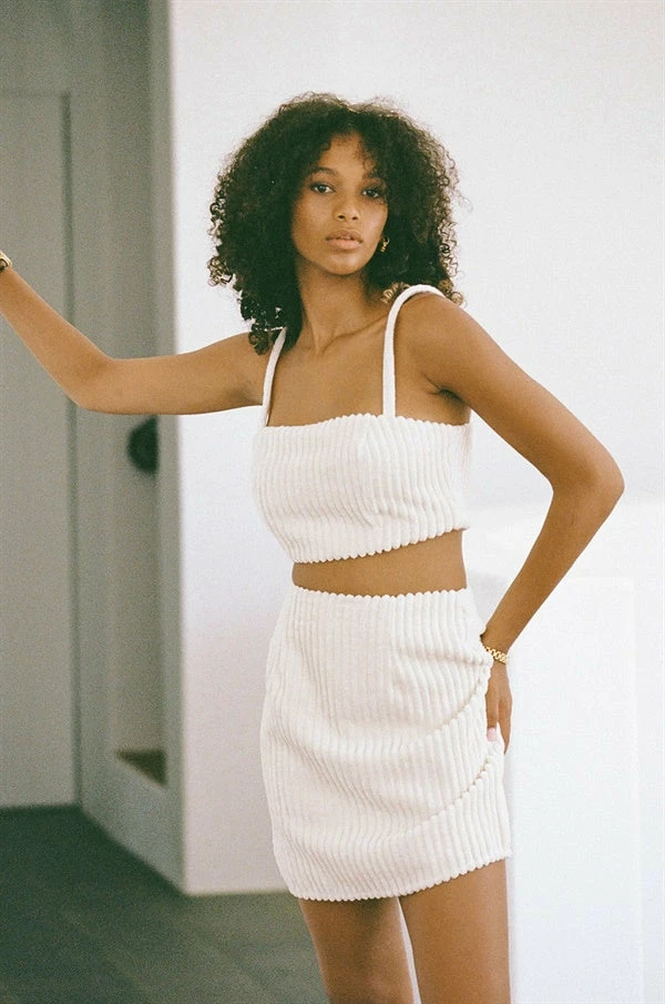 Wear it as a set or pair it with jeans! The Zarlo Top is a cropped style made from a minky cord fabric in a cream hue. Get the set with the Zarlo Skirt! Designed exclusively by Sabo.