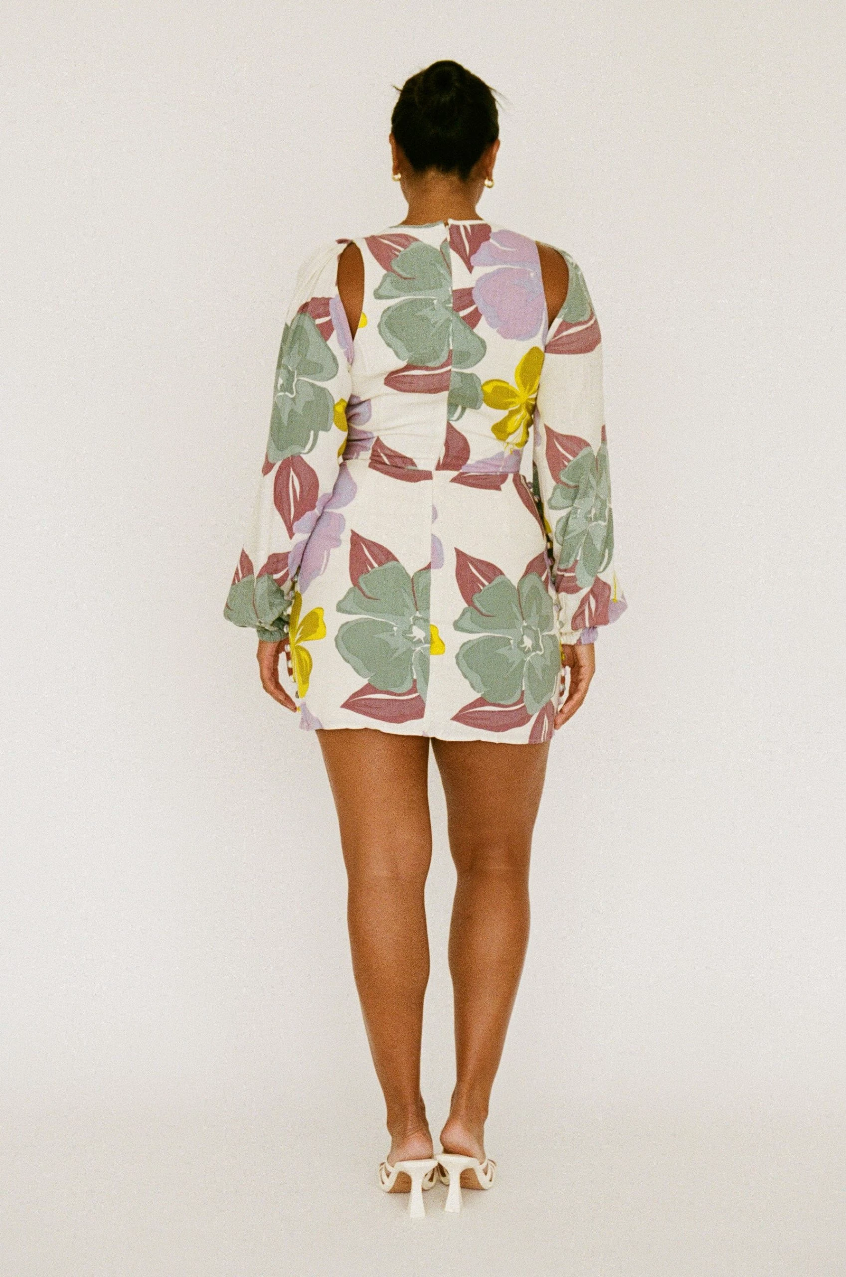 Designed to flatter, the Zelle Keyhole Dress is made from a high quality viscose linen blend fabric with our exclusive royal floral print. It features full length puff sleeves with gathered shoulders, high rounded neckline, cutout details at tops of arms, neckline and waist and covered button details at sides of skirt. Dress it up with Strappy Leila Heels for your next event! Designed exclusively by Sabo.