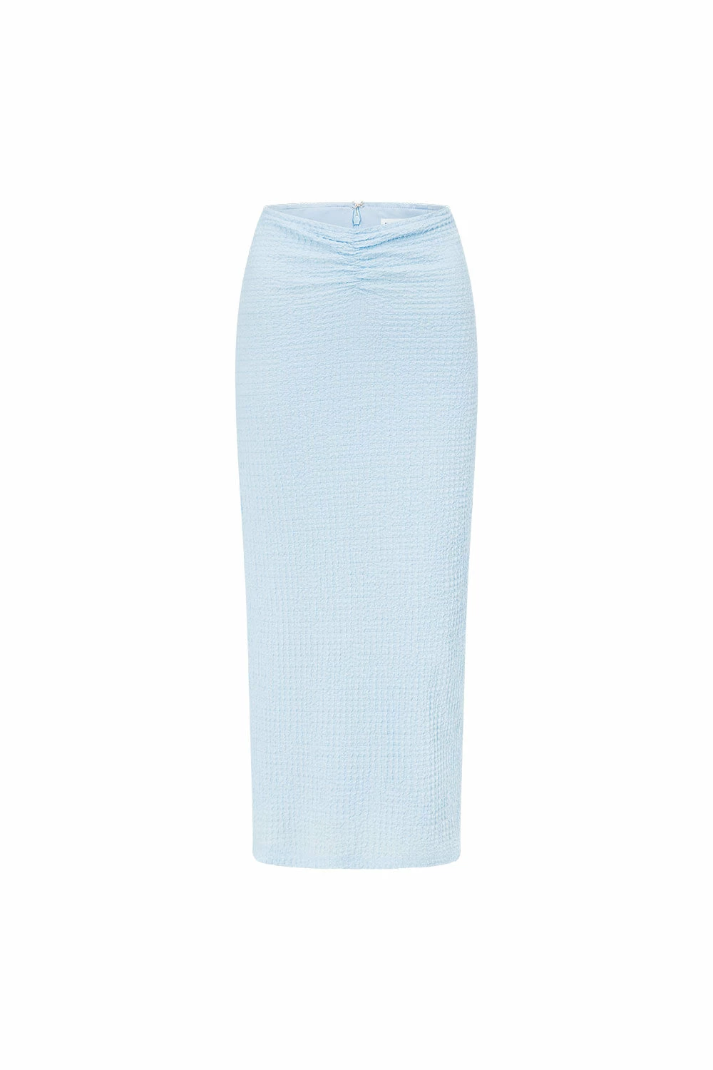 A simple flattering shape in the most flattering shade of blue! The Zura Midi Skirt is made from a textured bubble fabric featuring a slight V waist, gathered detail at centre front waist and a split at centre back. Get the look with the Zura Top and Jamilla Bag! Designed exclusively by Sabo.