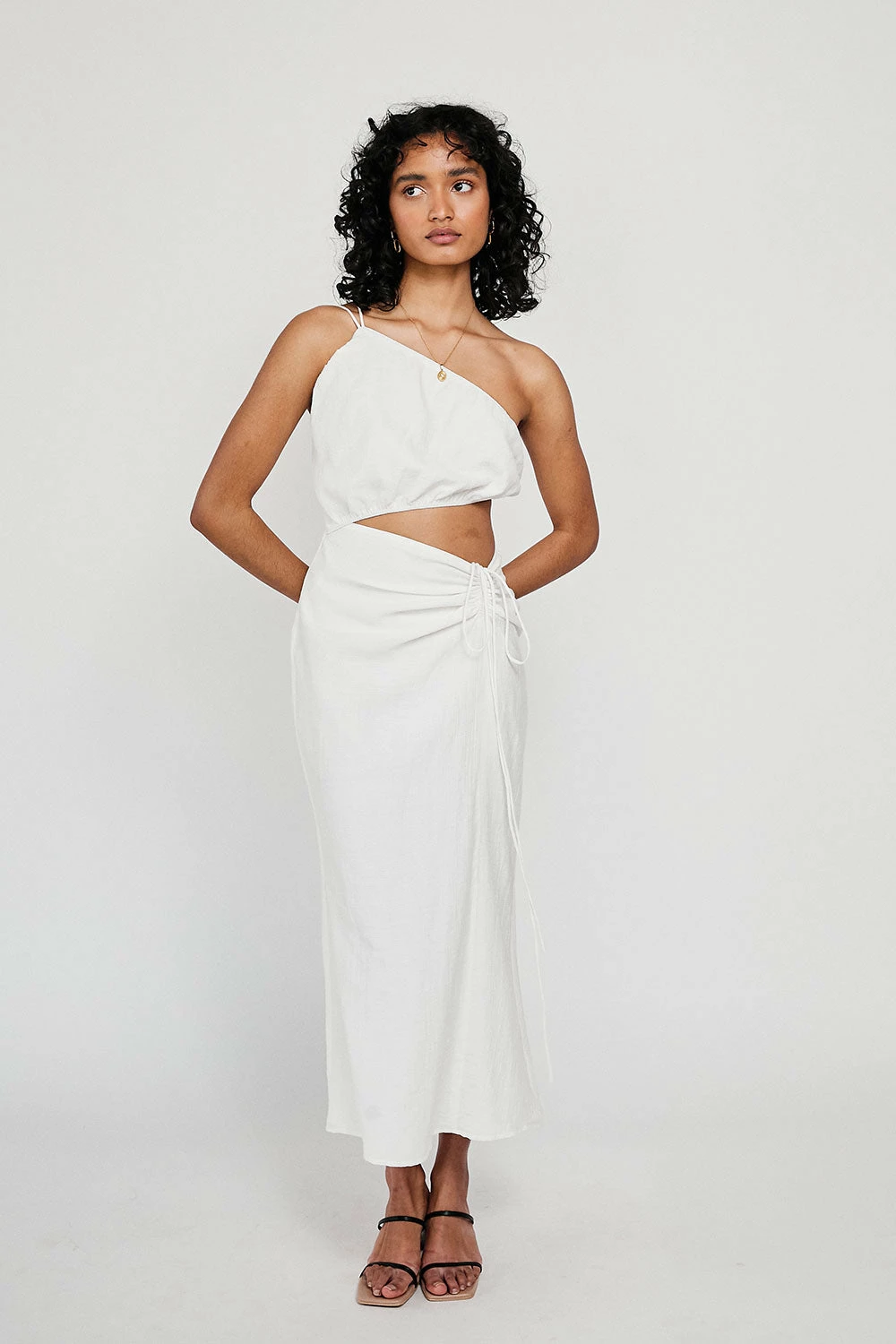 A design playing with asymmetric lines, cutouts and draw details! The Zuri Dress is made from a beautiful lightweight white fabric and features an asymmetric bust, open back, cutout at waist, midi length skirt and draw detail at side waist. Style with the Strappy Rafaela Heels and Briella Earrings! Designed exclusively by Sabo.